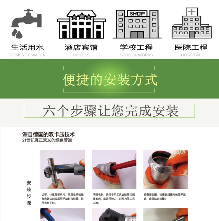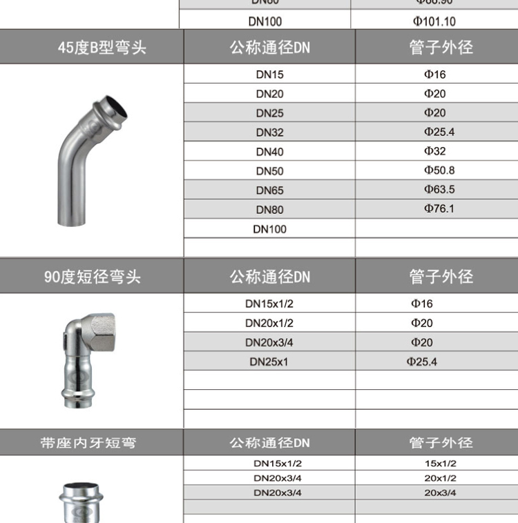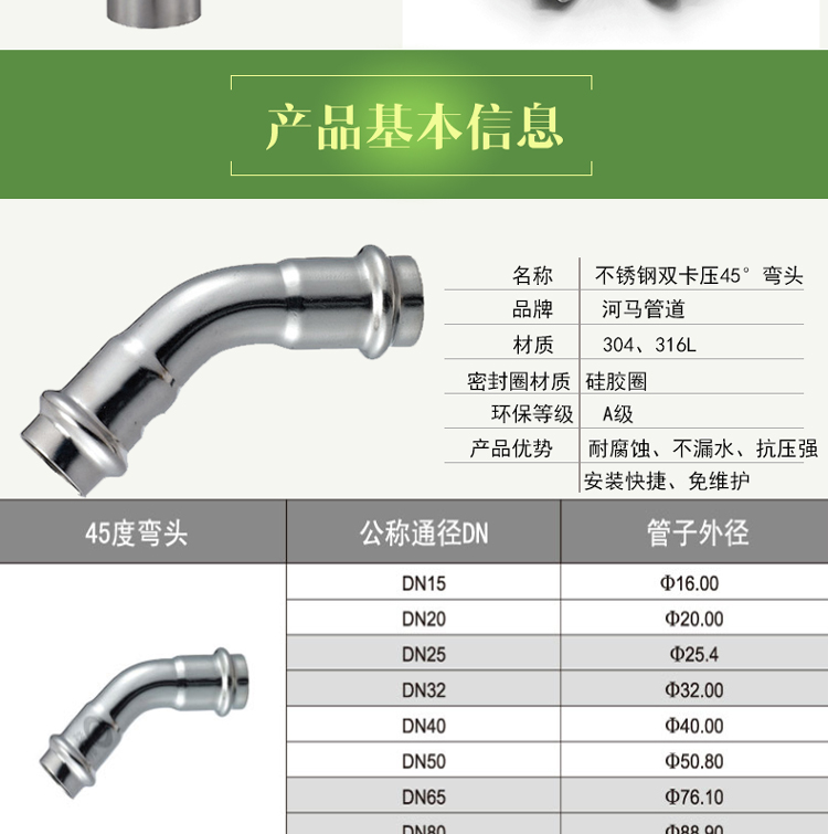 产品详情:河马不锈钢双卡压等径弯头45度管件给水管接头家装学校